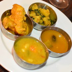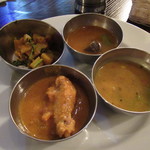 インドレストラン バーワルチー - 左手前:チキンカレー 左奥:ポテト 右奥:野菜 右手前:ラッサム