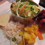 インドレストラン バーワルチー - 右奥から時計まわりで、チキンティッカ・オニオンピクルス・ポテトのアチャール・ベジタブルライス・パパド 中央奥:サラダ