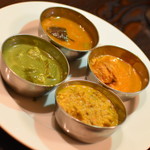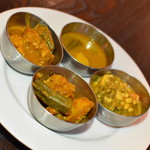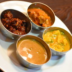 インドレストラン バーワルチー - ランチビュッフェ(1,000円)の『カレー。左から時計回りにチキン、野菜サンバル、ミックス野菜、アルビンディ』2019年1月
